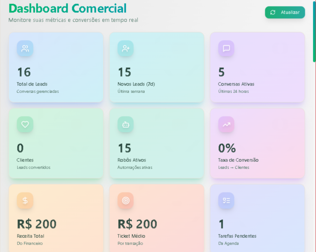 Visualize o que realmente importa: atendimentos em andamento, processos por status, tarefas da semana, metas e visão financeira — tudo em tempo real.