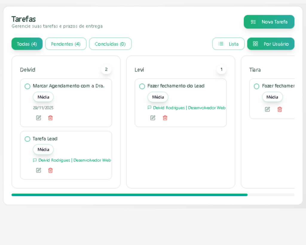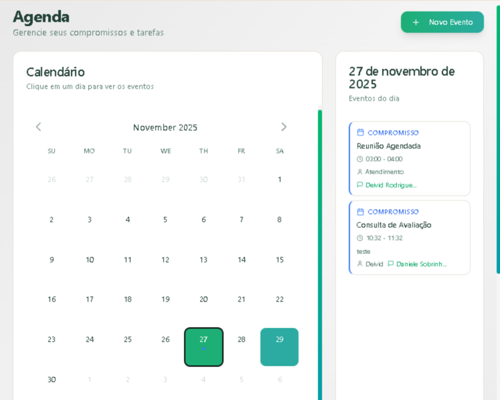 Agendamentos, compromissos e prazos em um só calendário, com visualização clara para não depender de lembretes manuais.